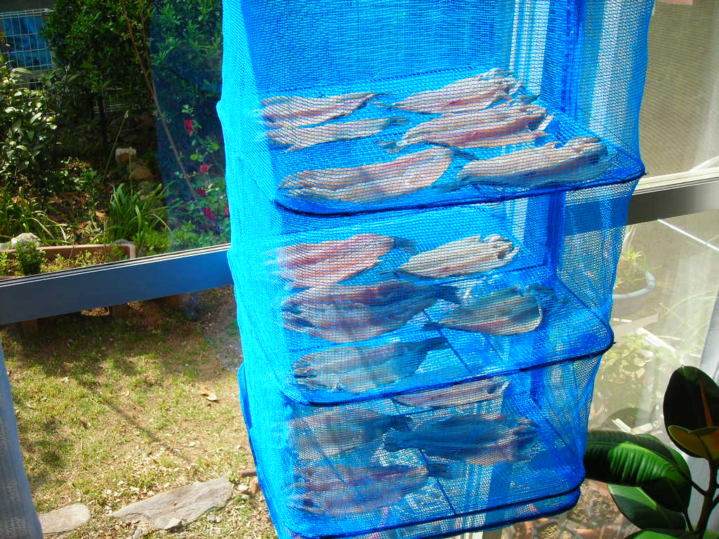 その後右のような網に並べて1日位天日で干します。(今回は黄砂が飛んでいるので窓越しで干しました。)