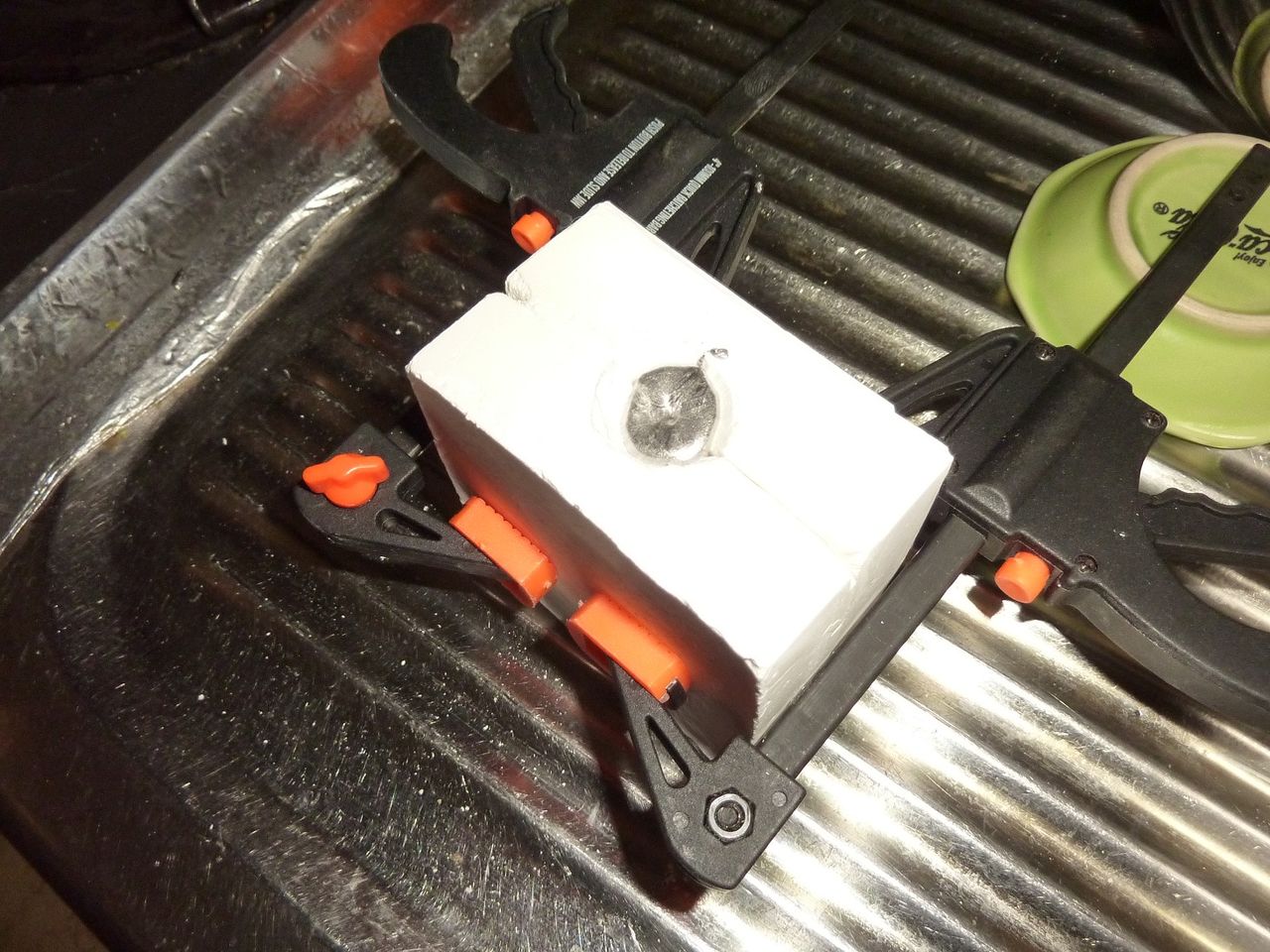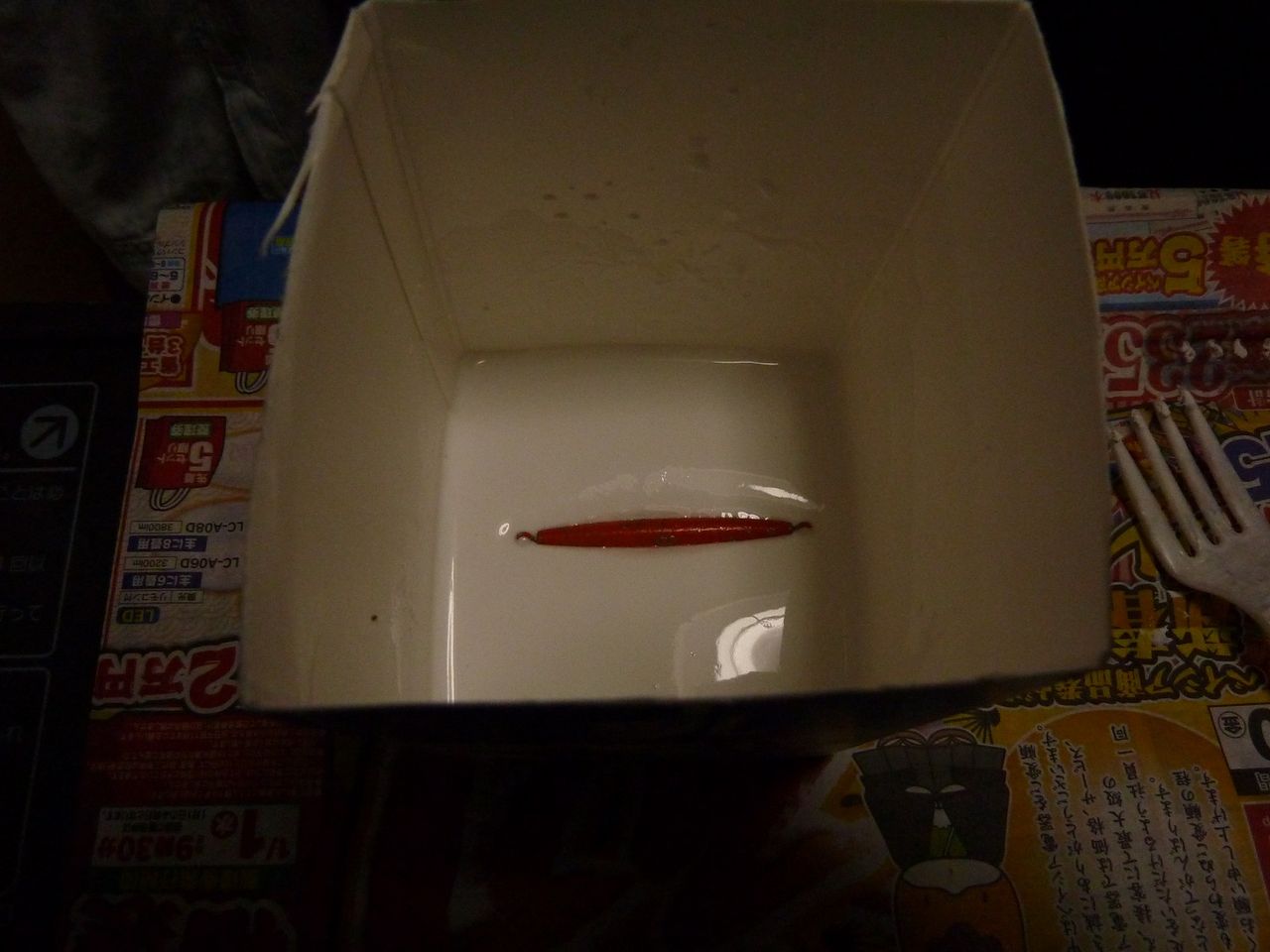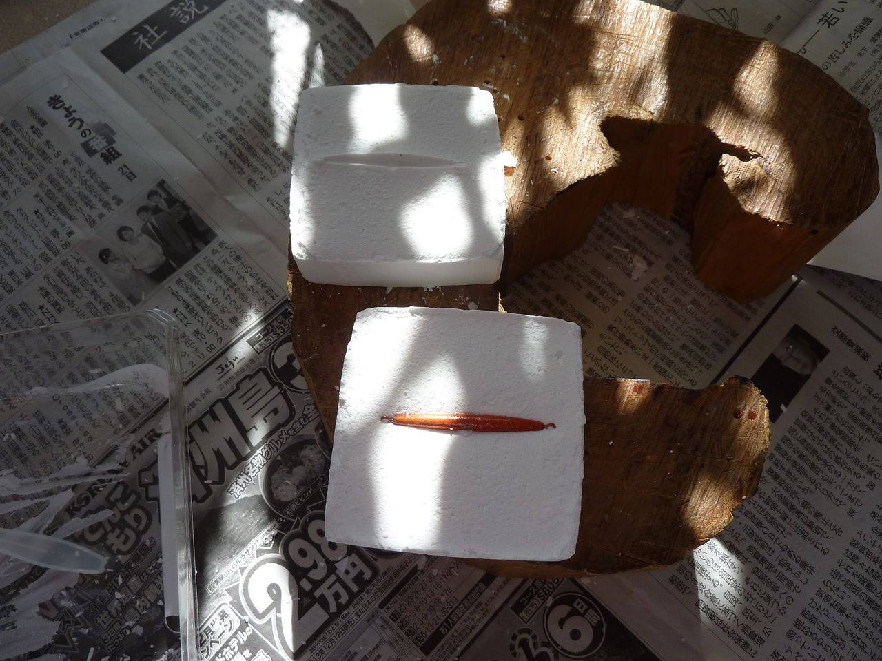 写真を見て頂ければ判ると思いますが紙パックの中で元のオモリの型を石膏で取ります。