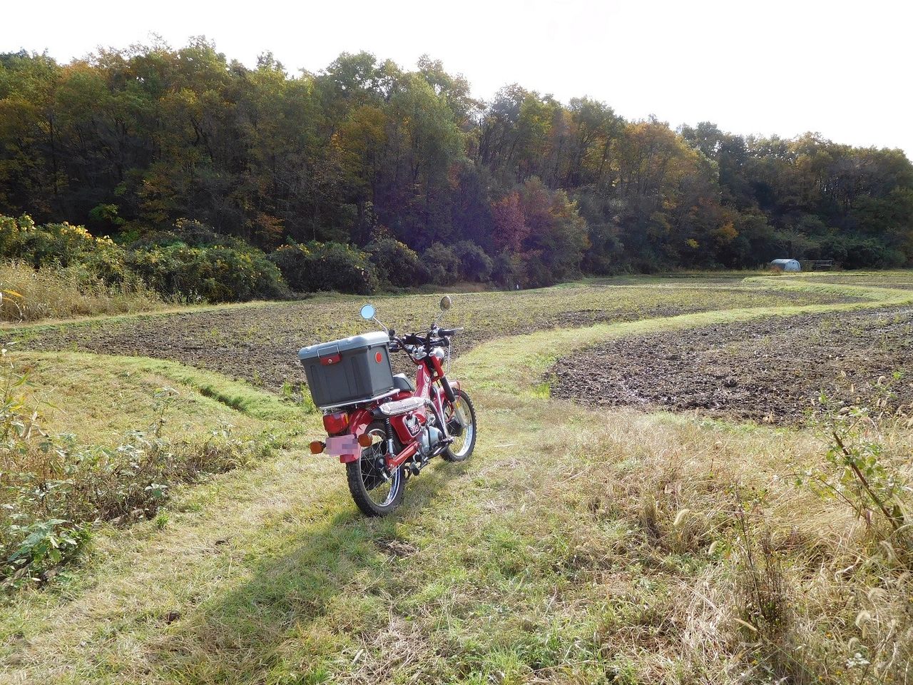 約1時間くらい走って目的地の山間の田んぼの畦道に赤いカブを止めます。
