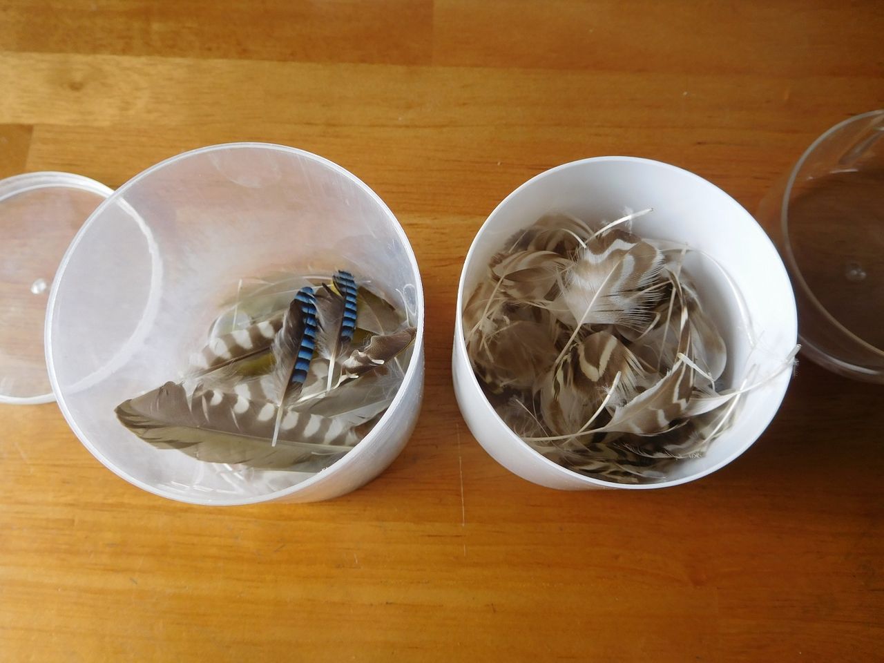 机の上の野鳥の羽入れの中をのぞくと去年拾って来た羽が少し入っていました♪