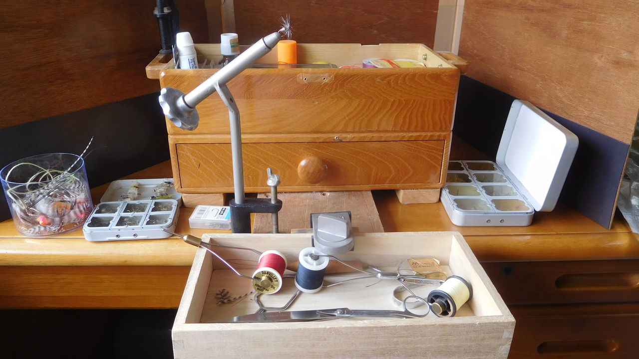 この箱は簡単に取り外せますので道具を出せばゴミは捨てられるし毛鉤を巻く時に