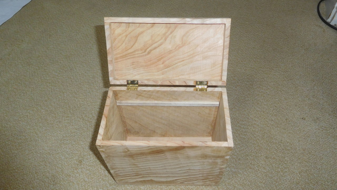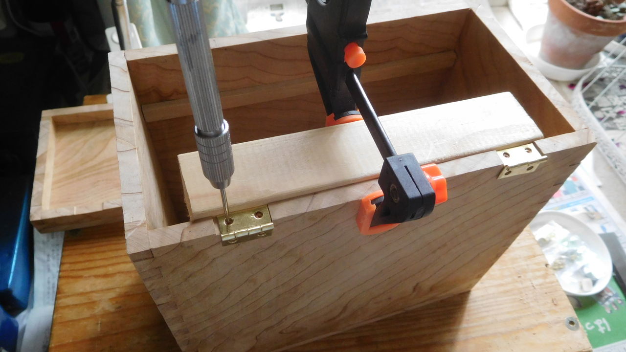 蝶番の厚さだけ蓋と箱に溝を作ってから当て板を添わせネジ止めしました。