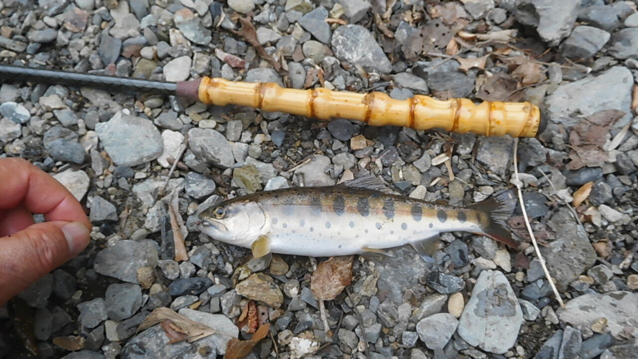 大型のヤマメには会えませんでしたが最後では尺イワナに足元の岩の中に逃げ込まれ
