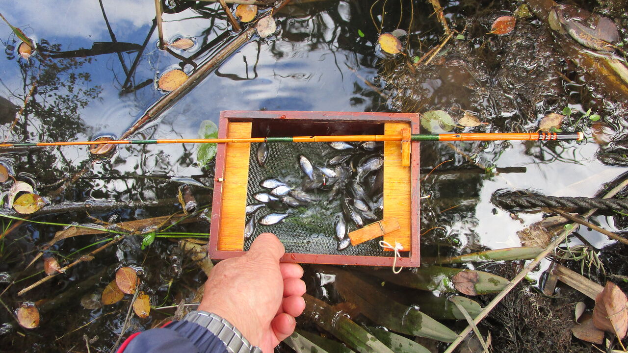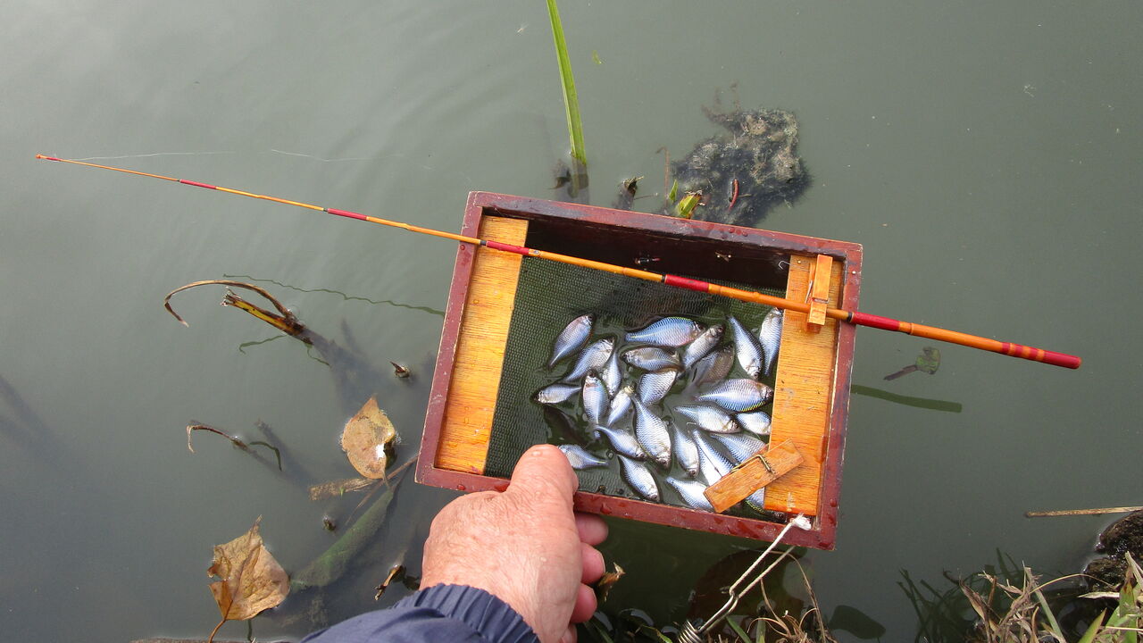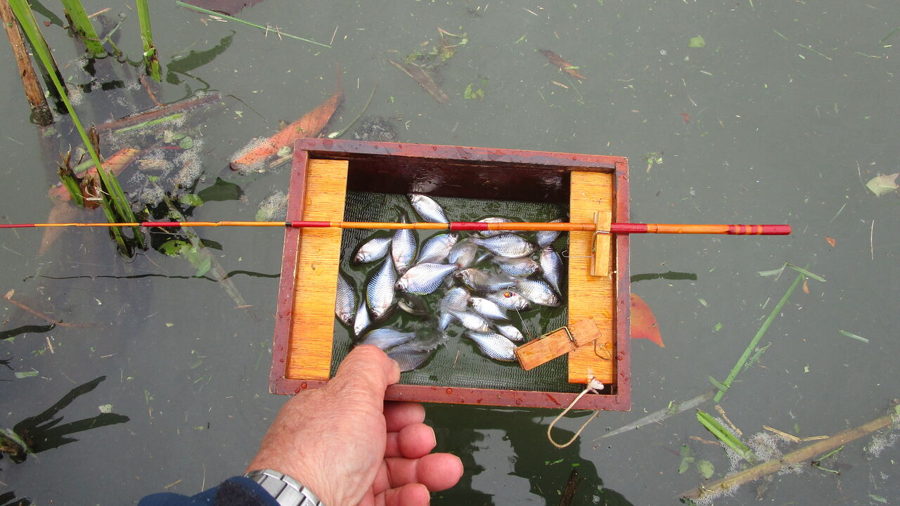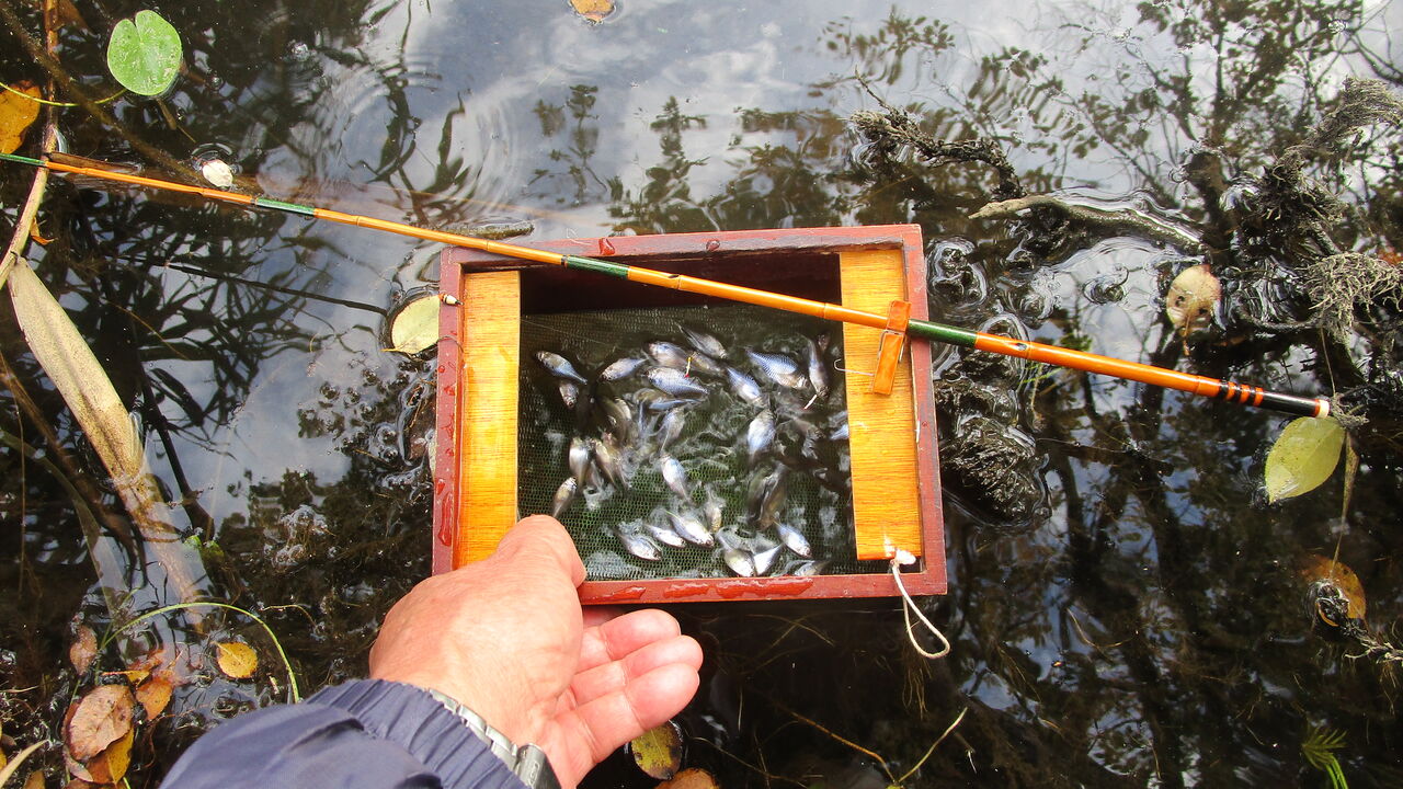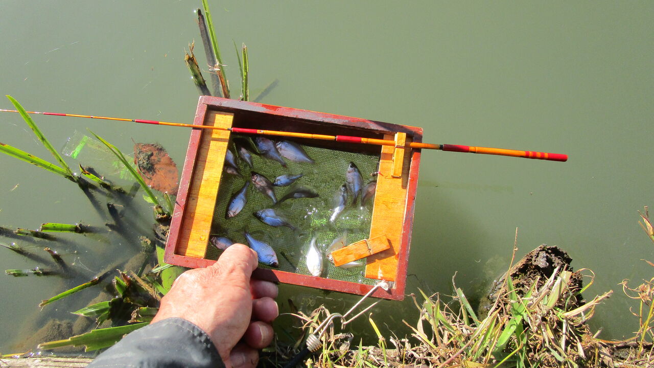 そして今回はいつも浮かし桶からタナゴたちが飛び出すので対策に落ち葉を中に浮かべて釣っているとガサゴソと少しうるさく成って来ましたね💦