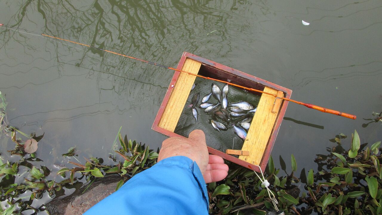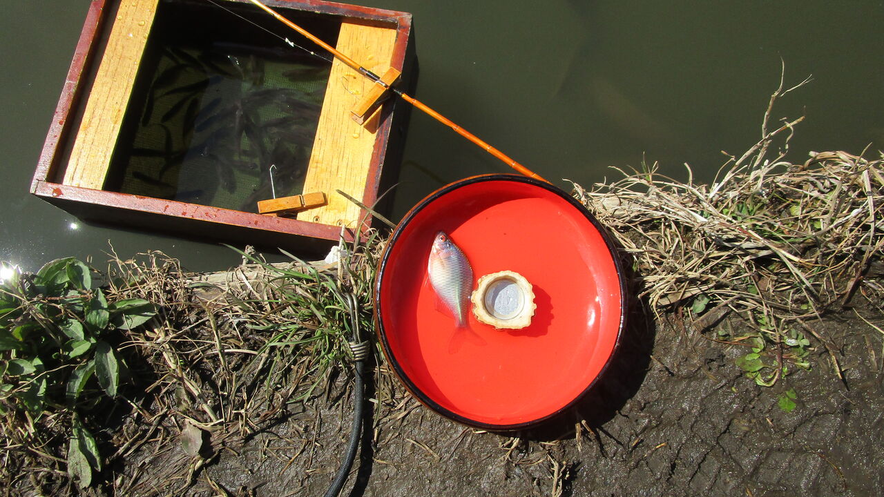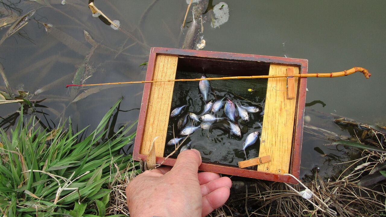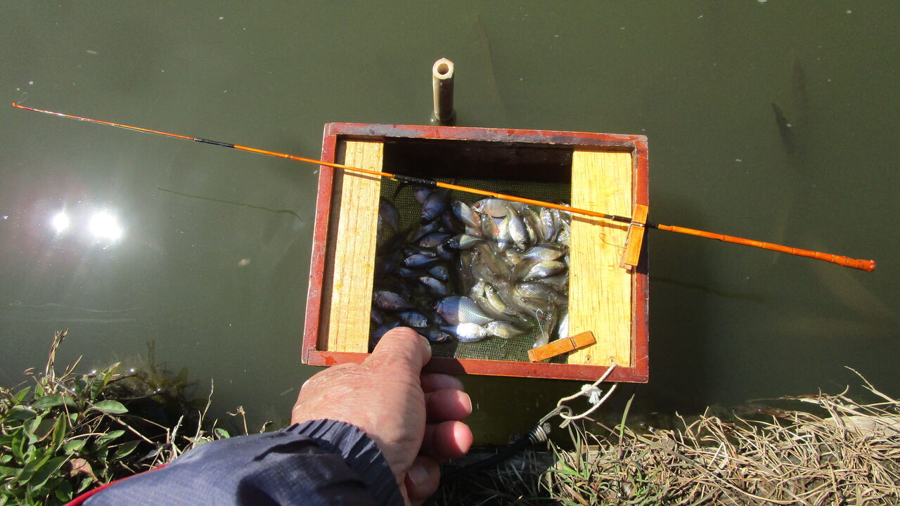 当日はタナゴ師さんが3名ほど釣られていましたので先ずは挨拶を済ませてから1人だけ対岸側に入り腰が痛く成る2時間くらい竿の調子をみながら釣った後に浮かし桶を持ち上げてみるとかなりの数が入っていましたね💦