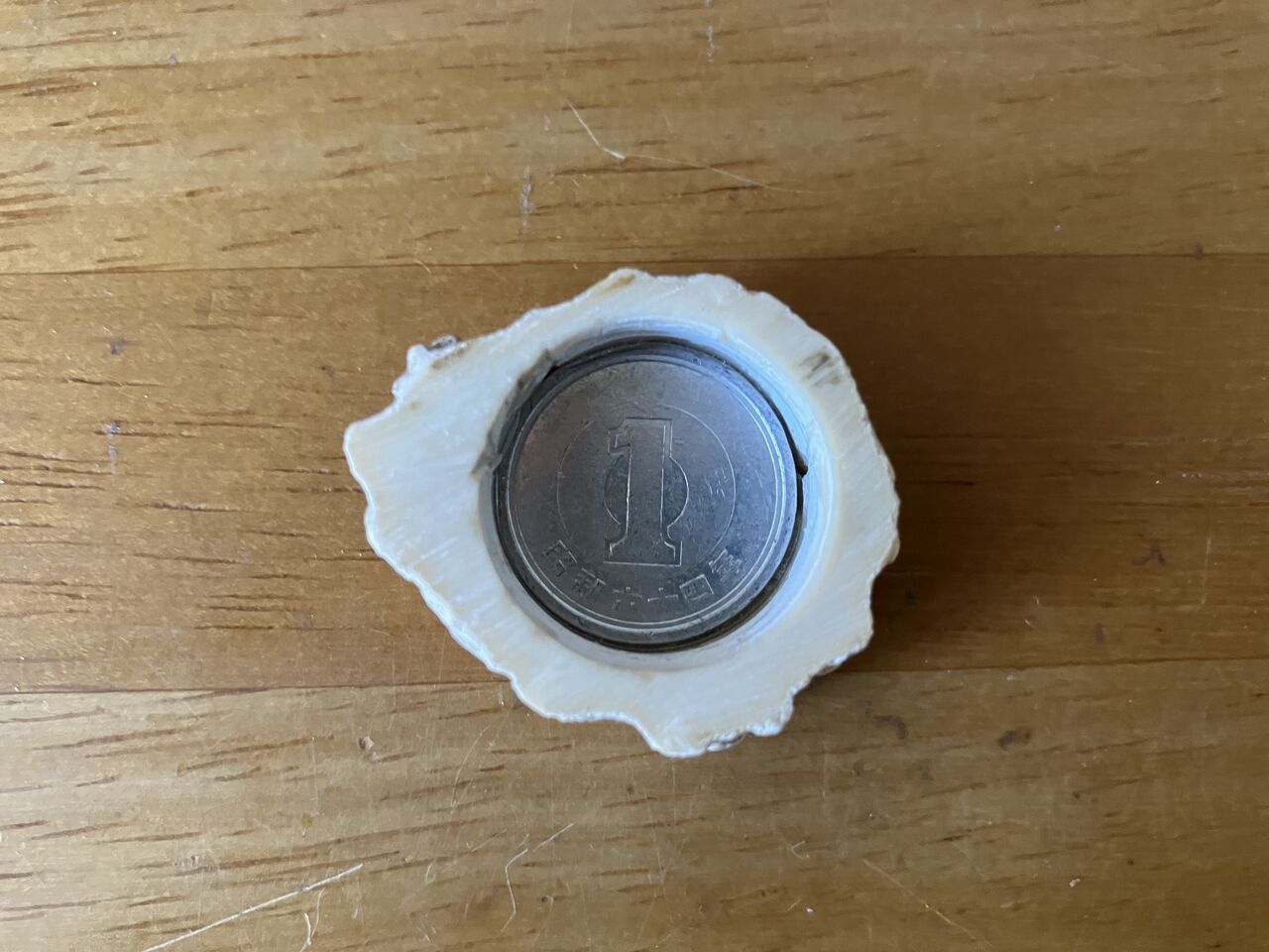 今回もやっと見つけた昭和64年製造の一円玉を鹿角にはめ込んでみましたが年度の文字が読めますかね?