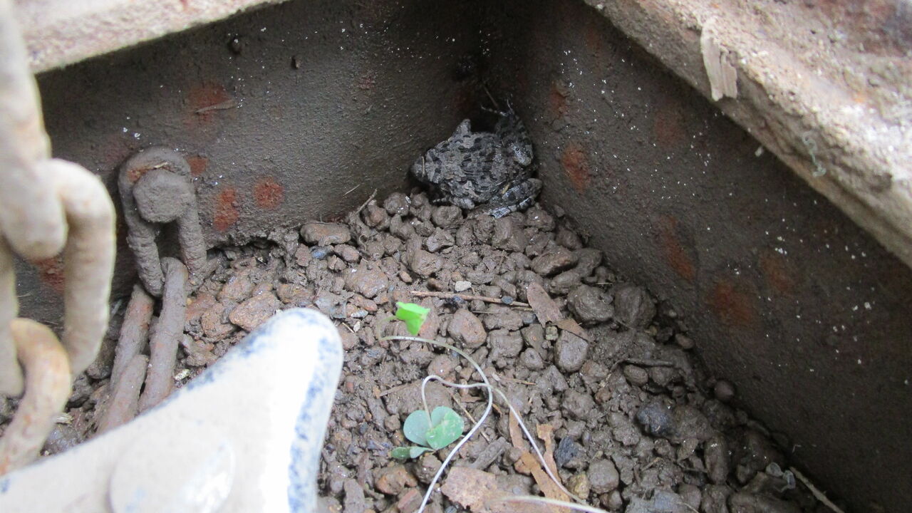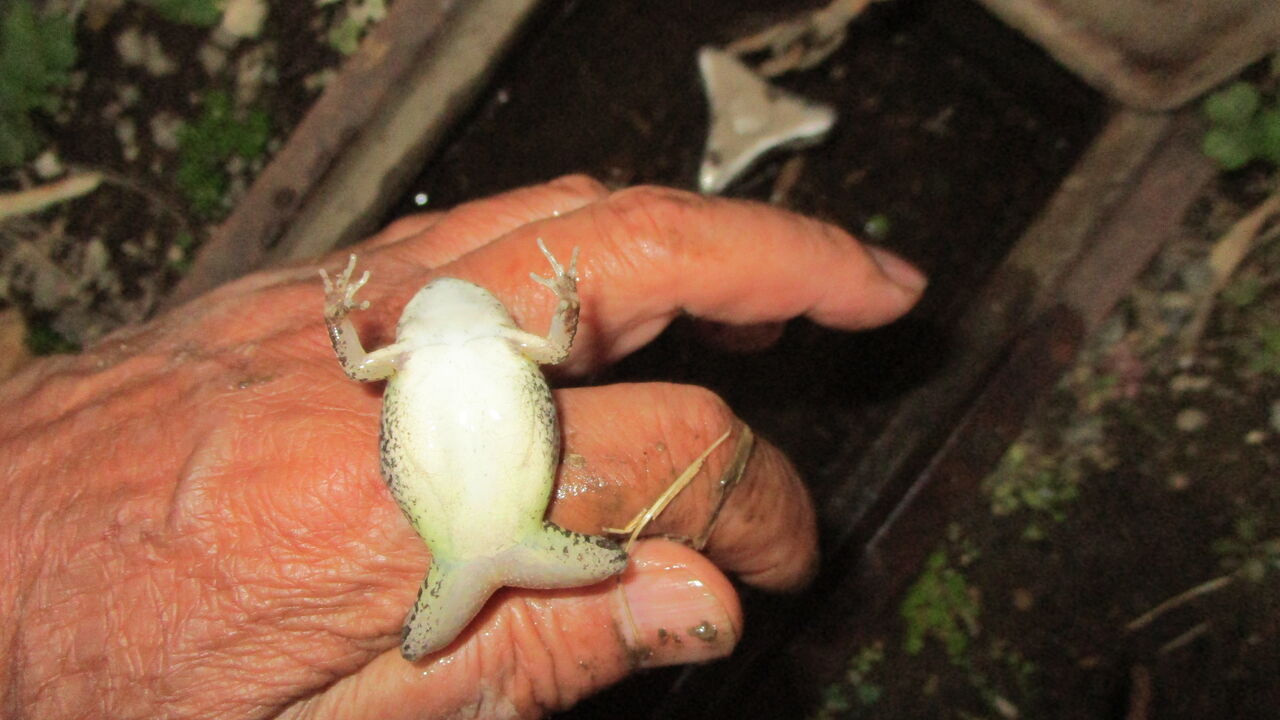 そっと上蓋を開けるとツチガエルかヌマガエルか分からないので捕まえてお腹を確認すると全体が白いのでこいつはヌマガエルのお坊ちゃまでしたね💦